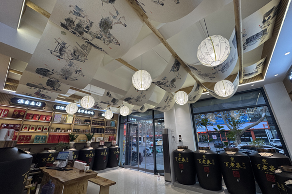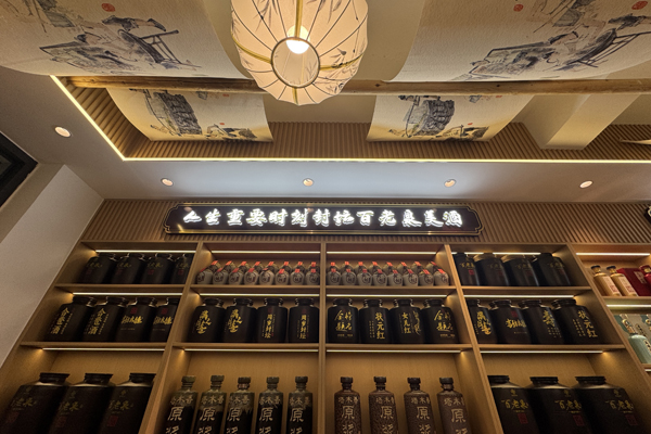 老酒窖的装饰是雅致的国潮风,尽显酒文化韵味。里面有几十种美酒可以定制、封坛,可以DIY泡果酒;还有舒适高雅的茶室,可以休闲、聊天、品酒。